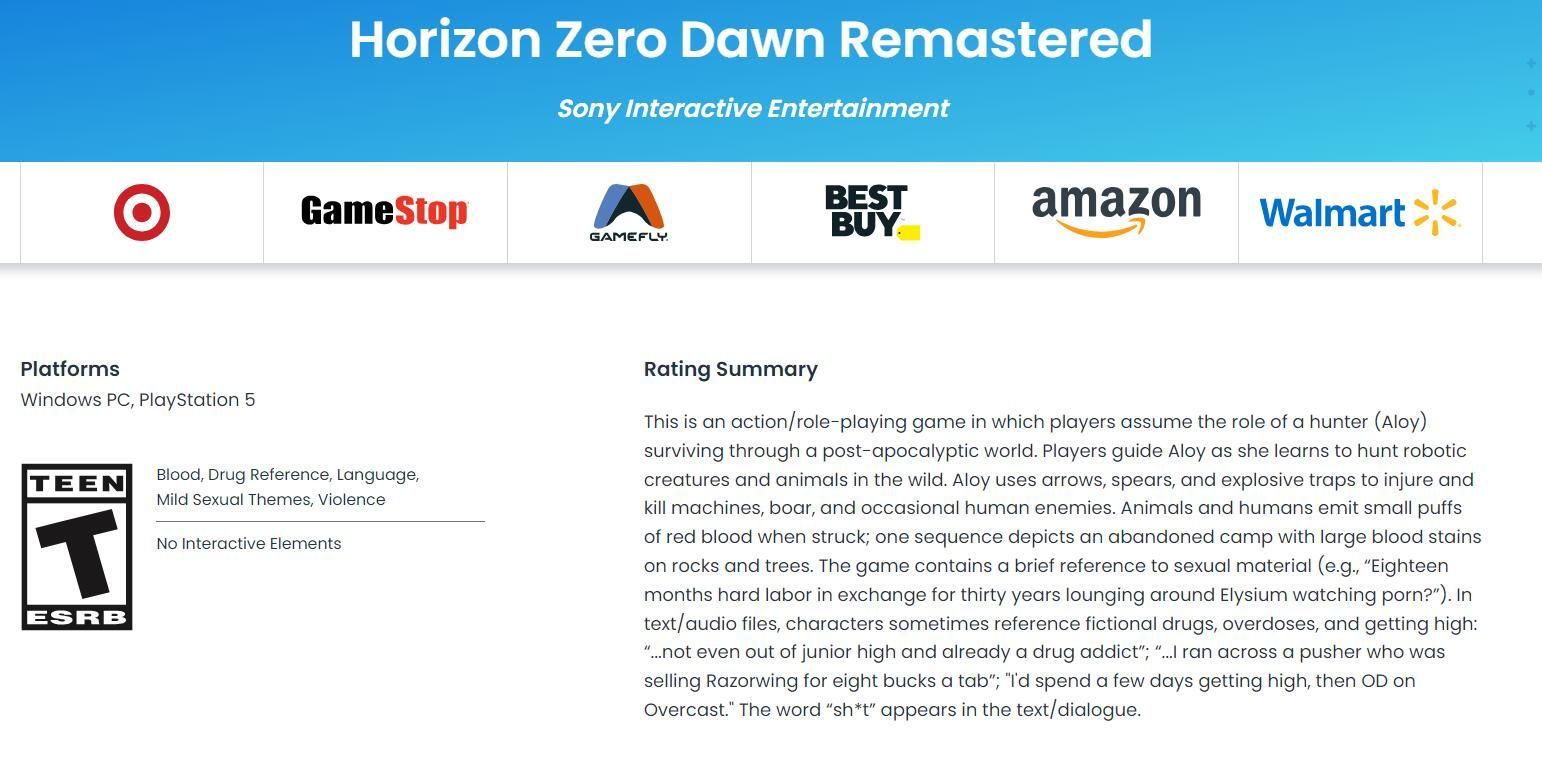 IT之家附上 ESRB 页面截图如下,可以看到《地平线:零之曙光》复刻版的相关描述,和 2017 年在 PlayStation 4 主机上发行的《地平线:零之曙光》完全一致。