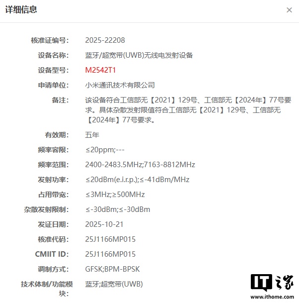 IT之家 10 月 24 日消息,一款型号为 M2542T1 的小米神秘设备于 10 月 21 日在工信部入网,支持 UWB 技术,目前尚不清楚这款新品的更多消息。