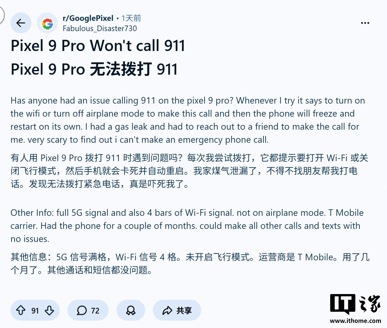 IT之家援引博文介绍,还有 Pixel 10 Pro XL、Pixel 9 Pro XL 和 Pixel 8 的用户报告了类似遭遇,涉及的运营商包括 T-Mobile、AT&T 和 Cricket Wireless。