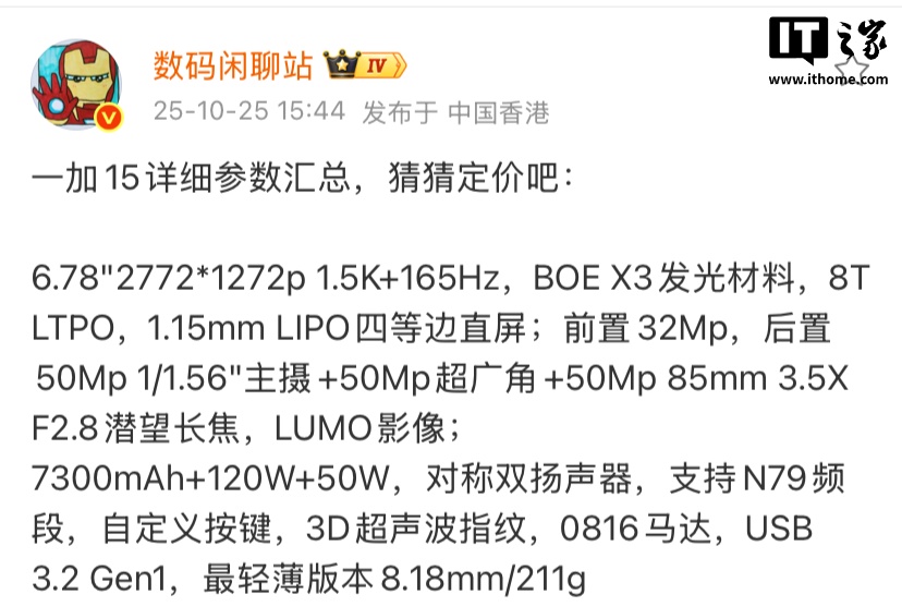 IT之家 10 月 25 日消息,一加 15 将于 10 月 27 日 19:00 发布,博主 @数码闲聊站 按照惯例对新机的详细参数进行了曝光。