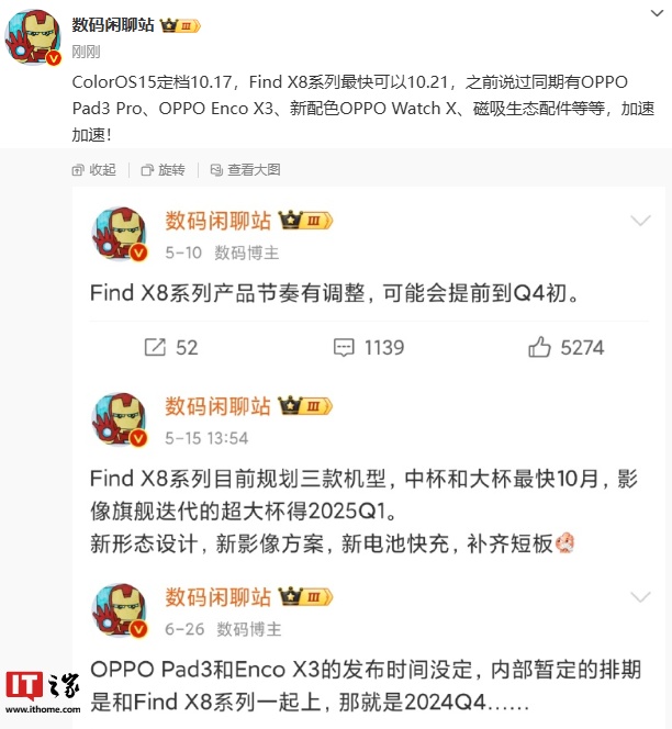 IT之家 9 月 19 日消息,在 OPPO 官宣 2024 开发者大会定档 10 月 17 日之后,博主 @数码闲聊站 今日爆料称:“Find X8 系列最快可以 10.21”,同期有 OPPO Pad 3 Pro、OPPO Enco X3、新配色 OPPO Watch X、磁吸生态配件等。