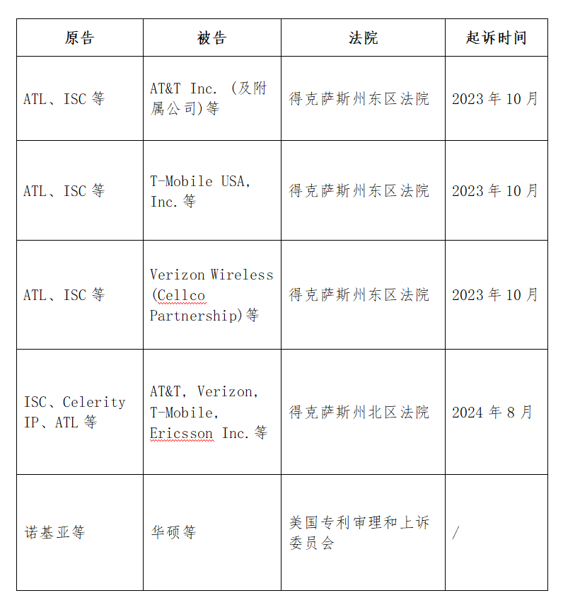 2024年8月开始,华硕在美国得克萨斯州东区联邦地区法院和得克萨斯州北区联邦地区法院等法院针对美国主要移动网络运营商:AT&T、Verizon和 T-Mobile USA,以及关键的网络设备供应商爱立信发起专利侵权诉讼,指控被告侵犯了其多项与4G LTE和5G通信标准相关的标准必要专利,例如涉及载波聚合技术以及无线通信系统中二次小区释放方法的美国专利US 9,237,489和US 7,664,059。