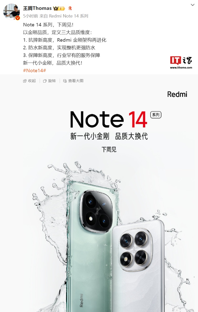 IT之家 9 月 19 日消息,小米中国区市场部副总经理、Redmi 品牌总经理王腾今日发文宣布,Redmi Note 14 系列手机“下周见”。