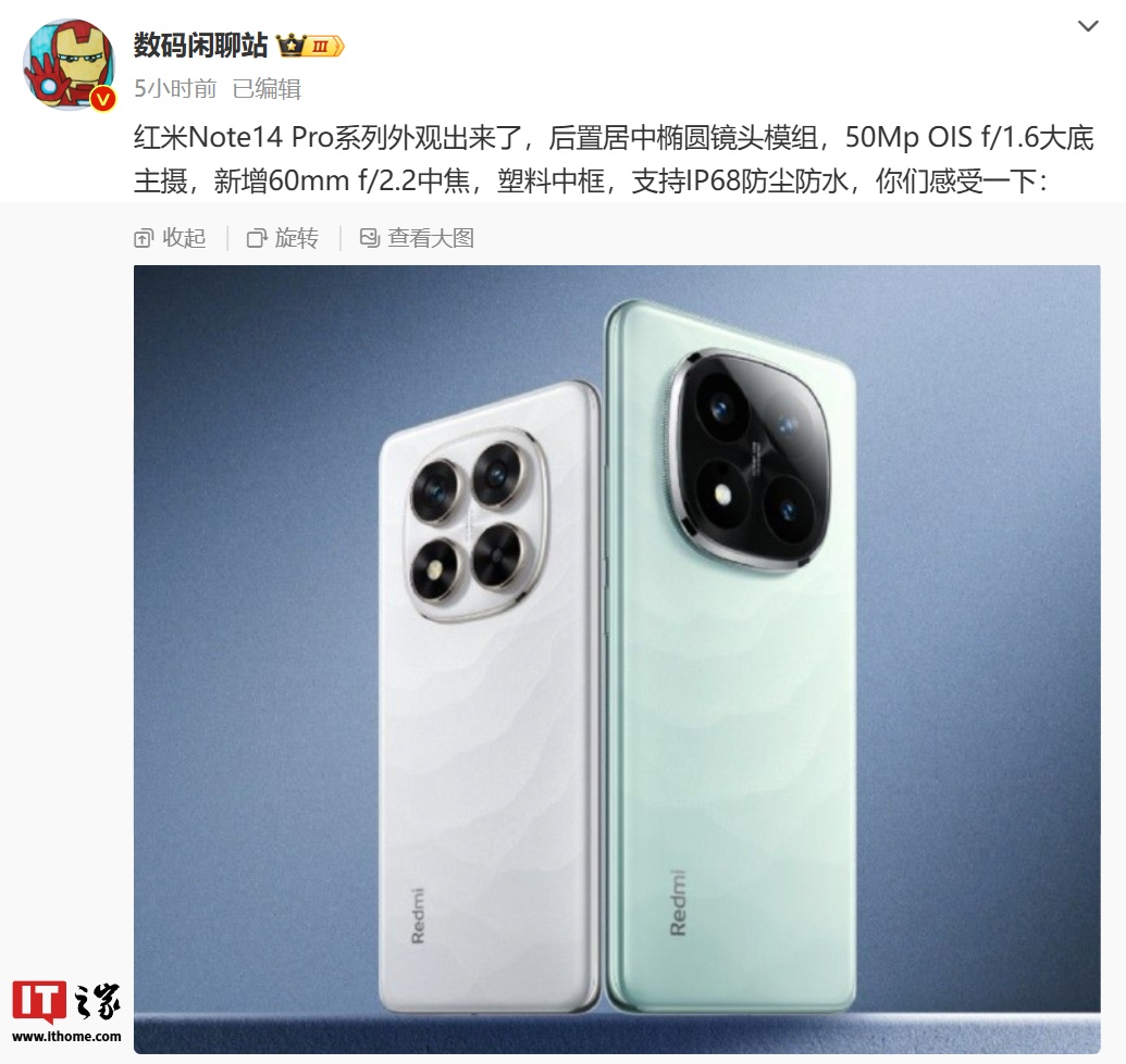 IT之家注意到,官方此前预热海报中出现的白色新机与卢伟冰此次公布的有所不同。结合此前爆料来看,海报中机型或为 Redmi Note 14 Pro,配备 50Mp 大底主摄影像系统,没有 2 亿,没有长焦镜头,塑料中框,支持 IP68 防尘防水。