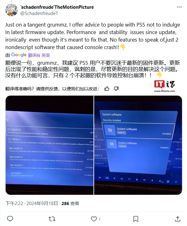 IT之家 9 月 19 日消息,科技媒体 Tom's Hardware 昨日(9 月 18 日)发布博文,报道称索尼本周面向 PlayStation 5 游戏主机推送的固件更新(24.06-10.00.00)存在 BUG,导致《最终幻想 XVI》、《黑神话:悟空》和《死亡搁浅》等游戏无法正常运行。
