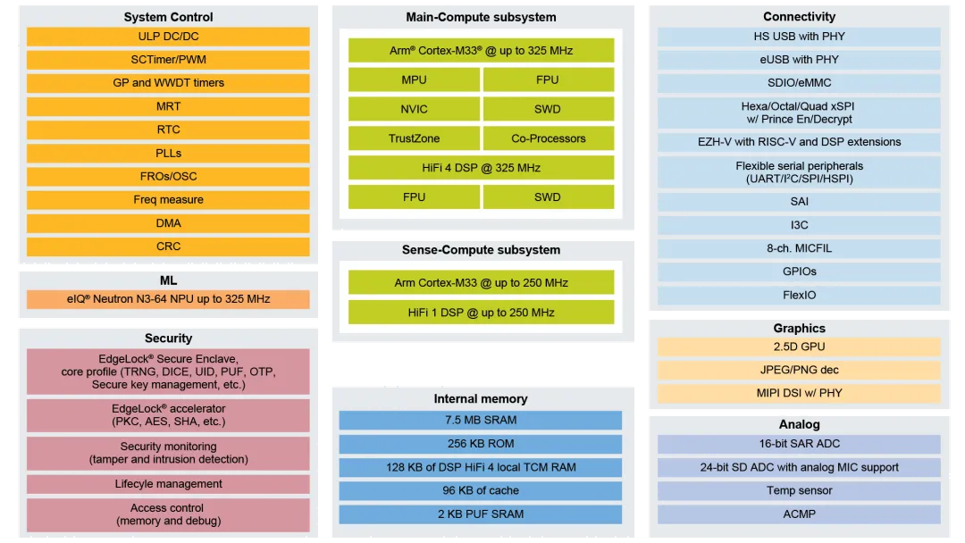 i.MX RT700配备了HiFi4/HiFi1 DSP, 专注于音频处理,可通过专用音频指令集 + 硬件通路持续处理高速数据流。除此之外,HiFi4 DSP也是一颗性能强劲的通用处理核心,可以运行复杂的任务。
