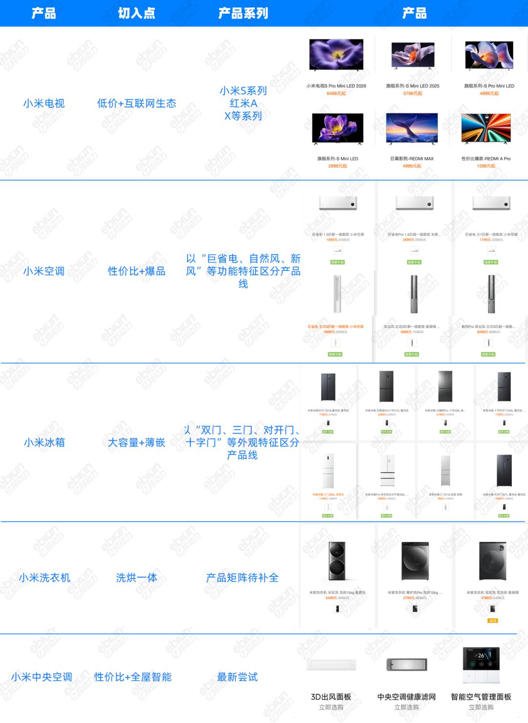 对家电行业来说,小米带来了一套完全不同增长路径。小米的互联网打法是一套高度协同的“组合拳”,通过论坛、社交媒体深度互动圈定用户,用高性价比的硬件产品(主要是手机)吸引流量,持续为用户提供高性价比的消费硬件(包括但不限于:平板、耳机、AI眼镜、插排、空气净化器、热水器、空调、冰箱、洗衣机、汽车等),通过互联网增值服务实现盈利。