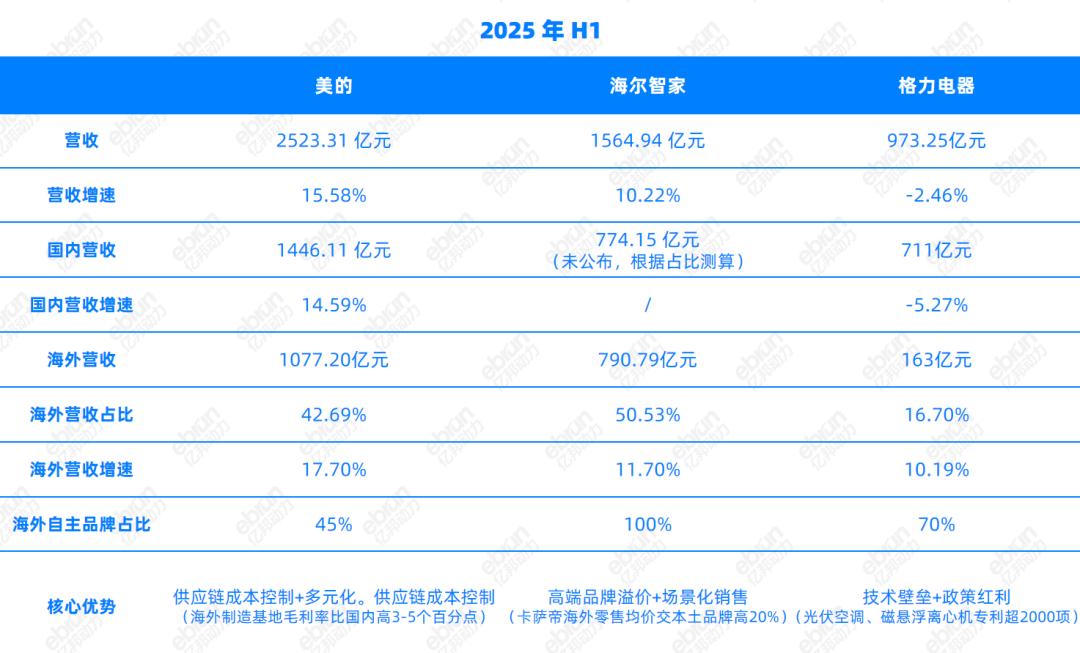 2025年上半年,美的集团营收2523.31亿元,同比增长15.58%;海尔智家营收规模突破1500亿元关口,同比增长10.22%;格力电器营收973.25亿元,同比下滑2.46%。美的全面领跑,海尔高端突围,格力则面临承压转型。