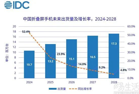 日前调研机构IDC公布的最新预测数据显示,预计2024年国内折叠屏手机市场的出货量或将达到1068万台、同比增长52.4%,至2028年国内折叠屏手机出货量有望超过1700万台,五年复合增长率可能会达到19.8%。此外,IDC方面预计国内折叠屏手机的出货量将会占据全球这一细分市场40%左右的份额。