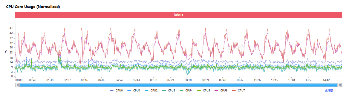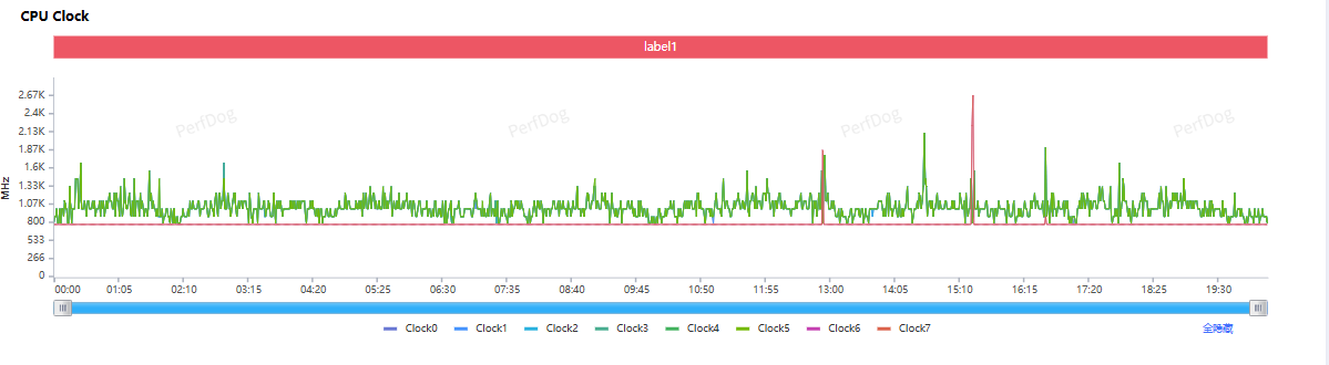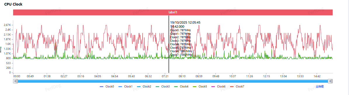 再看 CPU 的核心调度,这次是两枚超大核心有比较积极的调用,在 0.8GHz-2.67GHz 之间频繁波动调度,而 6 个性能核心的调度相对稳定,主要在 0.8GHz-1.07GHz 之间波动。