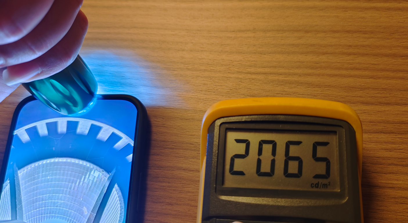 测试时,小编使用强光手电,差不多可以将其屏幕的局部亮度激发到 2065nits,虽然没有达到实验室测试的水平,但也确实能看到这块屏幕的显示亮度还是非常高的。