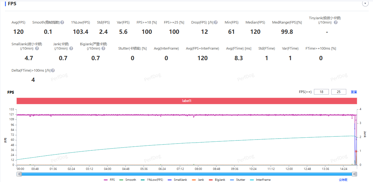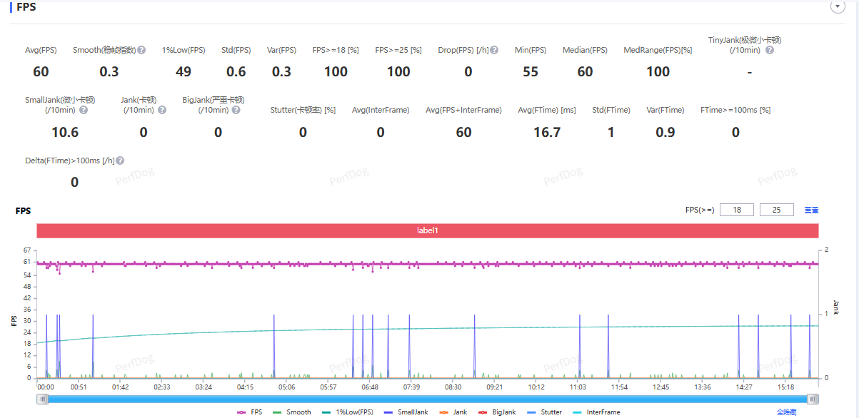 跑图 15 分钟后,测得游戏运行平均帧率为 60 FPS,整个过程也没有遇到卡顿掉帧的情况,帧率曲线上几乎没什么波动。