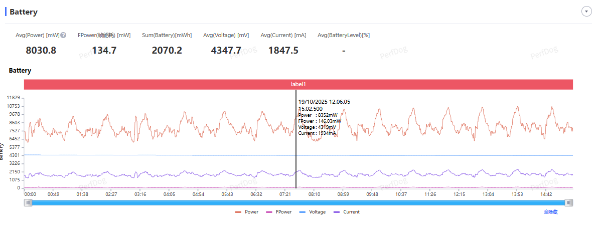 这样的调度策略下,REDMI K90 Pro Max 运行《崩坏:星穹铁道》黄金的时刻场景平均功耗为 8.03W,机身最高温度来到了 42.4℃,可见《崩坏:星穹铁道》黄金的时刻这个场景对性能的需求确实是比较大的,REDMI K90 Pro Max 还是能够保证平稳的帧率,机身温度和功耗稍微大了点,但游玩过程中也能接受,不会产生不适感。