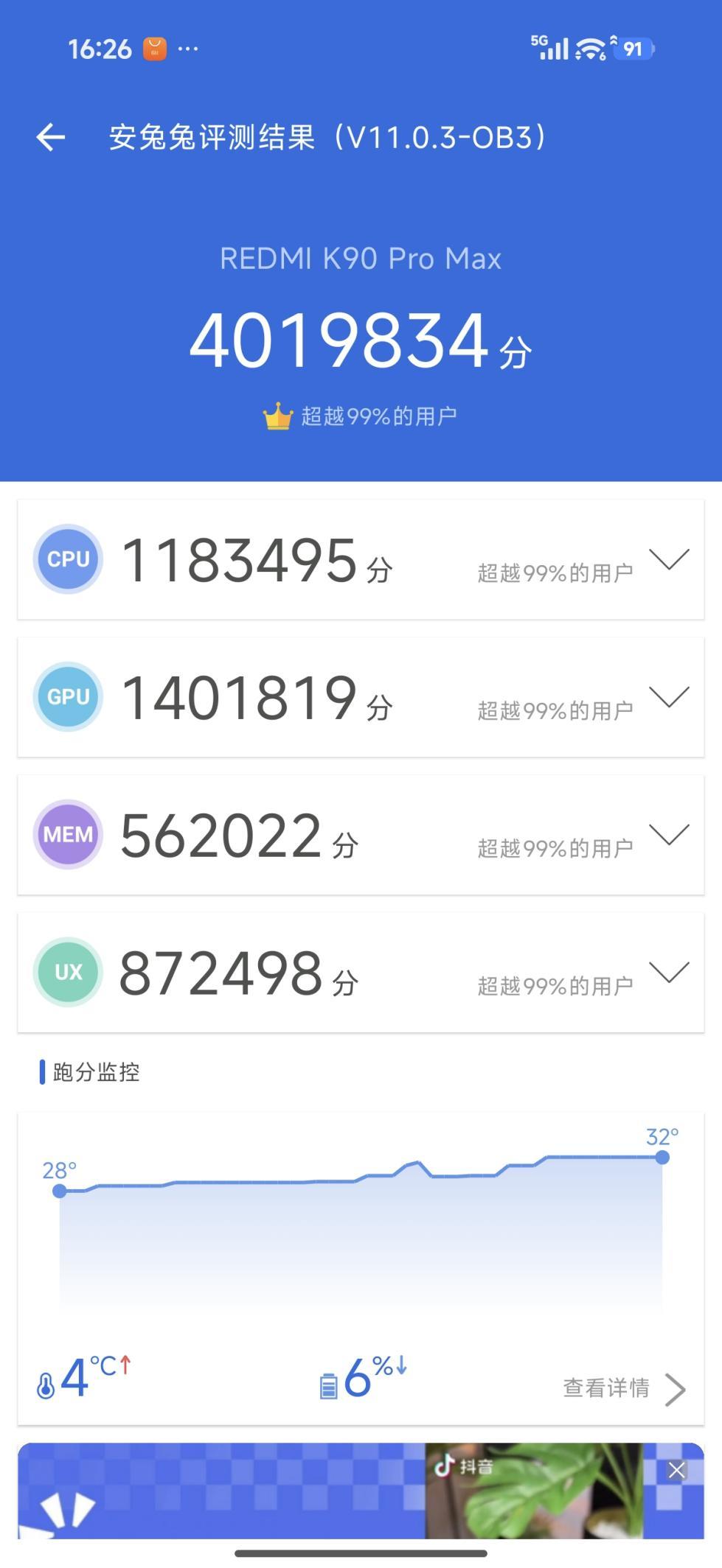 实际性能方面,IT之家首先对 REDMI K90 Pro Max 进行了安兔兔 V11 的综合跑分测试,其跑分成绩达到 4019834 分,其中 CPU 1183495 分,GPU 为 1401819 分,表现十分强劲。