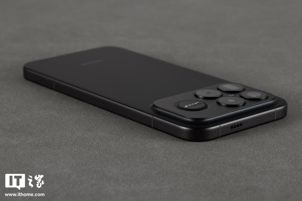 手机背面为玻璃纤维材质,表面做成了细腻的磨砂质感,摸起来十分细腻有品质,黑色版本色泽深邃,和相机 Deco 部分没有显著色差,有不错的视觉一体感。