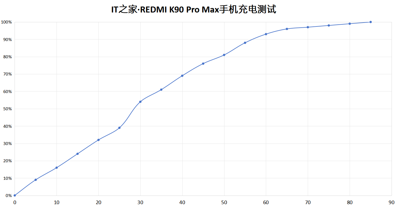 充电方面,IT之家也对这款手机做了充电测试,充电时手机初始电量为 0%,使用标配的 100W 充电器,20 分钟可充到 32% 的电量,充满电花了 85 分钟。