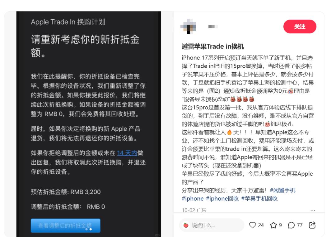 10月初,有网友发文称,在参与苹果Trade In换购计划时,将旧的iPhone 15 Pro以预估3200元的金额进行折抵换购iPhone 17系列。并表示这台15 Pro在自己手里没出过故障,也没用维修过,但苹果检测后以 “设备经未授权改动” 为由将折抵金额调整为0元。