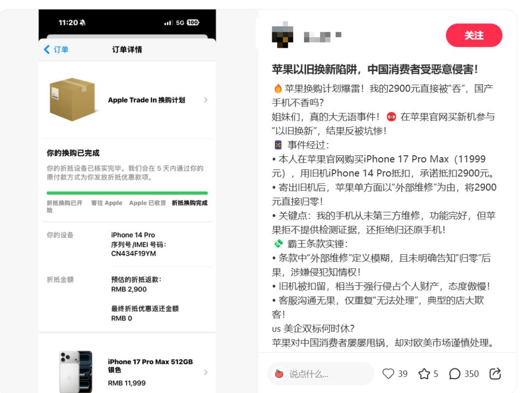 近日,有网友发文称,在苹果官网买新机参与换购活动,结果反被坑。