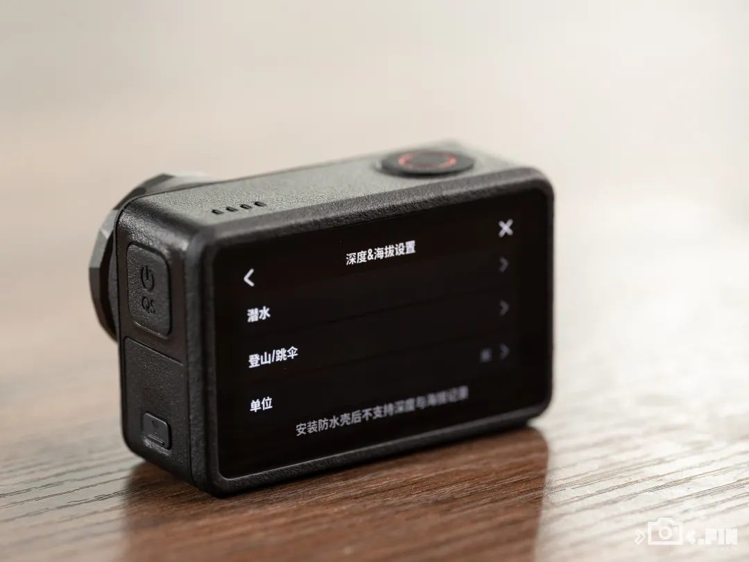 同时,设置里也多了深度和海拔设置,有潜水和登山跳伞两种场景可以选择,因为这一代 Action 5 Pro 支持了压力计,功能又变多了。