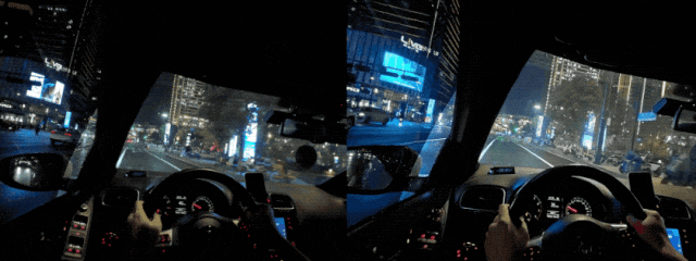 托尼这次特意晚上开车兜了好几圈,分别在指定路线上录制了三段视频,分别由 Action 4 、 Action 5 Pro 和 Action 5 Pro 的超级夜景模式录制。