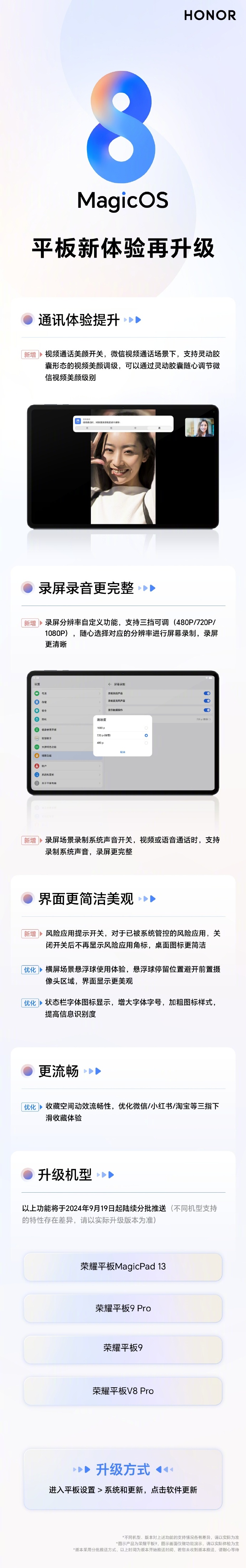 IT之家 9 月 20 日消息,据荣耀官方消息,荣耀平板 MagicPad 13 等平板产品迎来 MagicOS 8.0 新版更新,本次升级有自定义录屏分辨率、灵动胶囊形态的微信视频美颜调级、状态栏字体图标样式优化等。