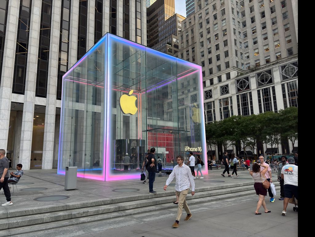 IT之家 9 月 20 日消息,苹果第五大道 Apple Store 零售店为庆祝 iPhone 16 系列发售,在其标志性玻璃立方体上点亮了 Apple Intelligence 颜色灯光。