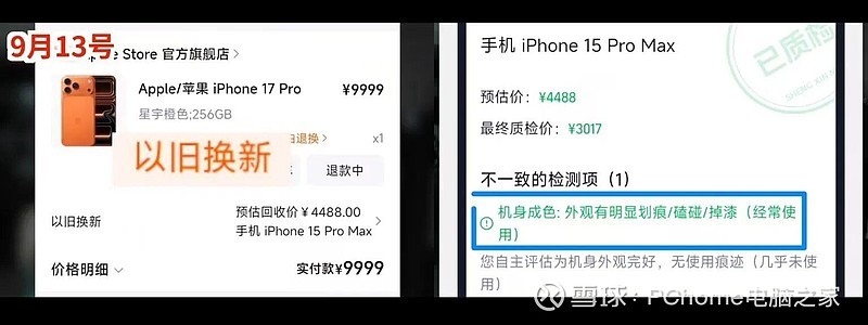 据该博主介绍,今年9月13日,自己在淘宝的苹果旗舰店以“以旧换新”购买iPhone 17 Pro Max,当时回收旧手机(iPhone 15 Pro Max)评估价格为4488元。然而当平台收到旧手机后,回收价格变更为3017元,系统增加了一个不一致的检测项,“机身成色:外观有明显划痕/磕碰/掉漆(经常使用)”。