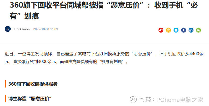 据该博主称,淘宝“以旧换新”是由一家名为“同城帮”的回收商提供服务,经查证,“同城帮”是360旗下提供手机、数码产品回收、以旧换新服务的平台,主要与天猫、苏宁等电商平台合作。然而,据黑猫投诉平台,对同城帮的投诉达1310条,投诉内容多为恶意压价。
