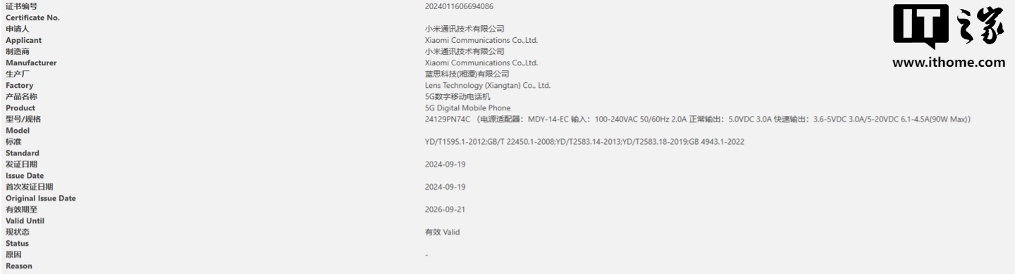IT之家 9 月 20 日消息,昨天有一款型号为 24129PN74C 的小米新机通过了 3C 质量认证,@数码闲聊站 称其为小米 15,支持最高 90W 快充。