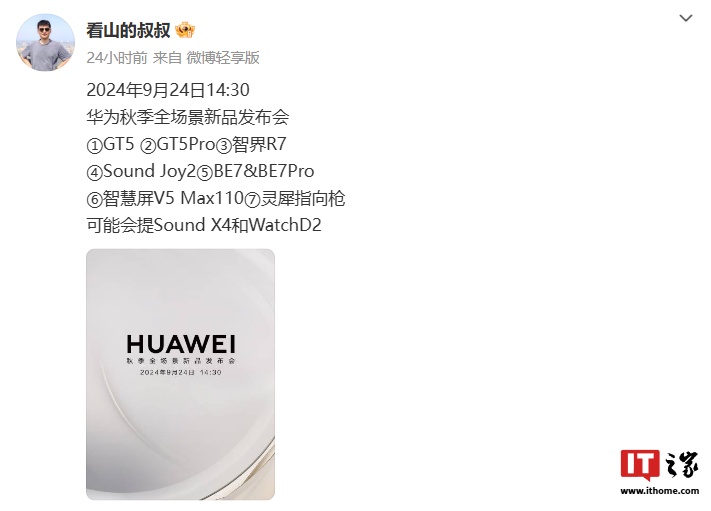 IT之家 9 月 20 日消息,华为秋季全场景新品发布会已官宣 9 月 24 日 14:30 举行。博主 @看山的叔叔 昨日发文称,发布会将带来 GT5 系列手表、Sound Joy 2、灵犀指向枪等新品。