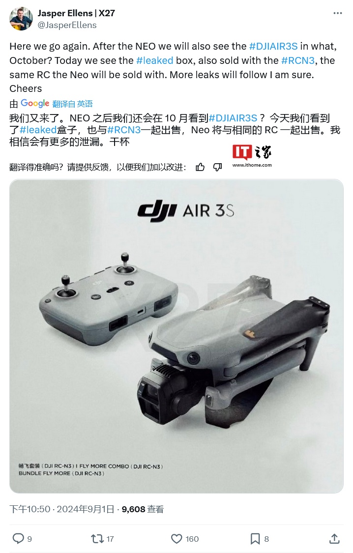 IT之家 9 月 20 日消息,消息源伊戈尔・波格丹诺夫(Igor Bogdanov)昨日在 X 平台发布推文,曝料称大疆 Air 3S 无人机售价情况。