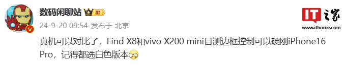 IT之家 9 月 20 日消息,OPPO 首席产品官、一加创始人刘作虎今日在微博分享了一张新机边框、下巴对比图。据博主 @数码闲聊站 透露,Find X8 和 vivo X200 mini 目测边框控制可以硬刚 iPhone16 Pro。