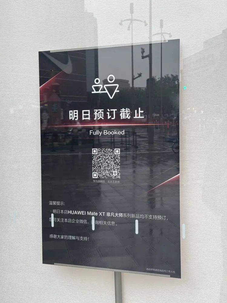 和华为现场的工作人员沟通了解到,目前华为 Mate XT 只会在此前完成“意向预定”的用户中抽取购买资格,收到短信提示可以来线下取货的用户可以直接到线下购买 Mate XT,其他用户想要购买,就只有在各大电商渠道 10:08 进行抢购。