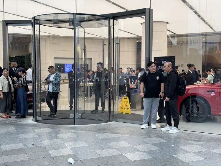 首先华为王府井旗舰店的开业时间为上午10:00,外加上店门口有一个指示牌显示今天用户无法在非预订情况下直接到店内交钱够买手机,这就让排队变的没有任何意义。