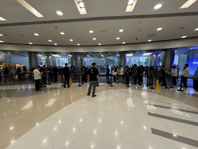 早晨 8:30,王府井 Apple Store 的门店内已经人头攒动。今天北京的这场大雨丝毫没有浇灭果粉大清早来购买新 iPhone 的热情,店门口取货到用户已经排上了大队,工作人员为了维持商场秩序也拉起了一米线。