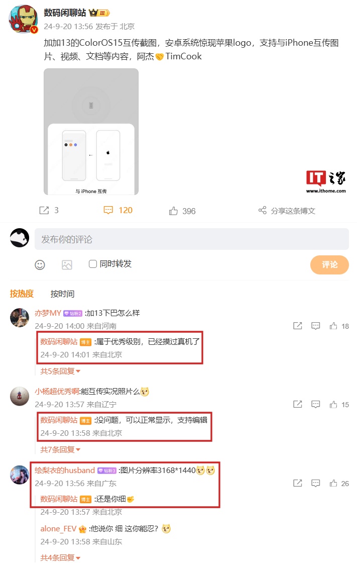 此外,博主还在评论区中回复了网友的问题:针对一加 13 下巴的情况,博主称“属于优秀级别”;针对能否互传实况照片,博主表示“没问题,可以正常显示,支持编辑”。另外,这张截图的图片分辨率为 3168*1440。