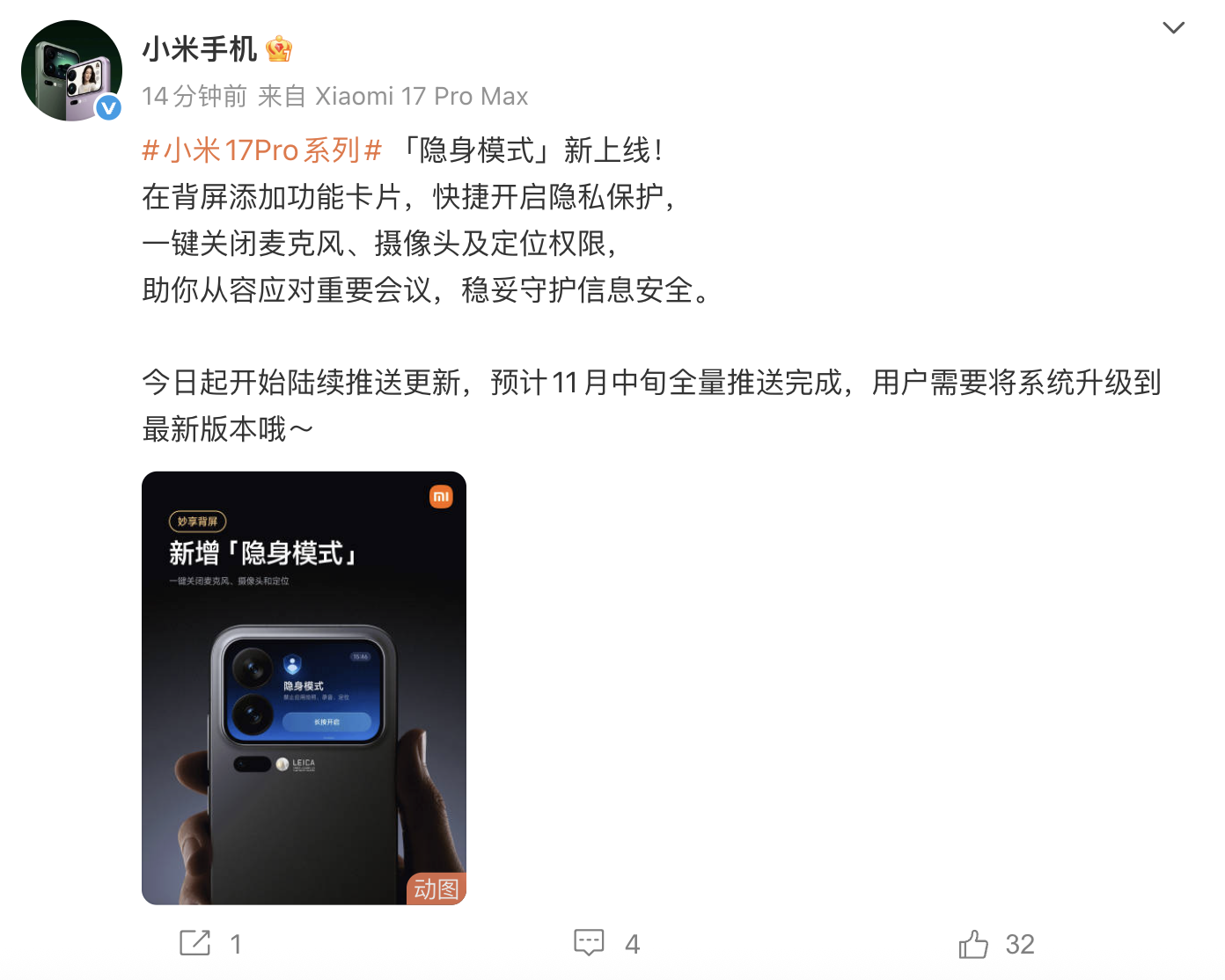 凤凰网科技讯 11月5日,小米手机官方宣布,小米17 Pro系列“隐身模式”今日起陆续推送更新,预计11月中旬全量推送完成,用户需将系统升级至最新版本。据官方介绍,用户可在背屏添加功能卡片,快捷开启隐私保护,一键关闭麦克风、摄像头及定位权限。