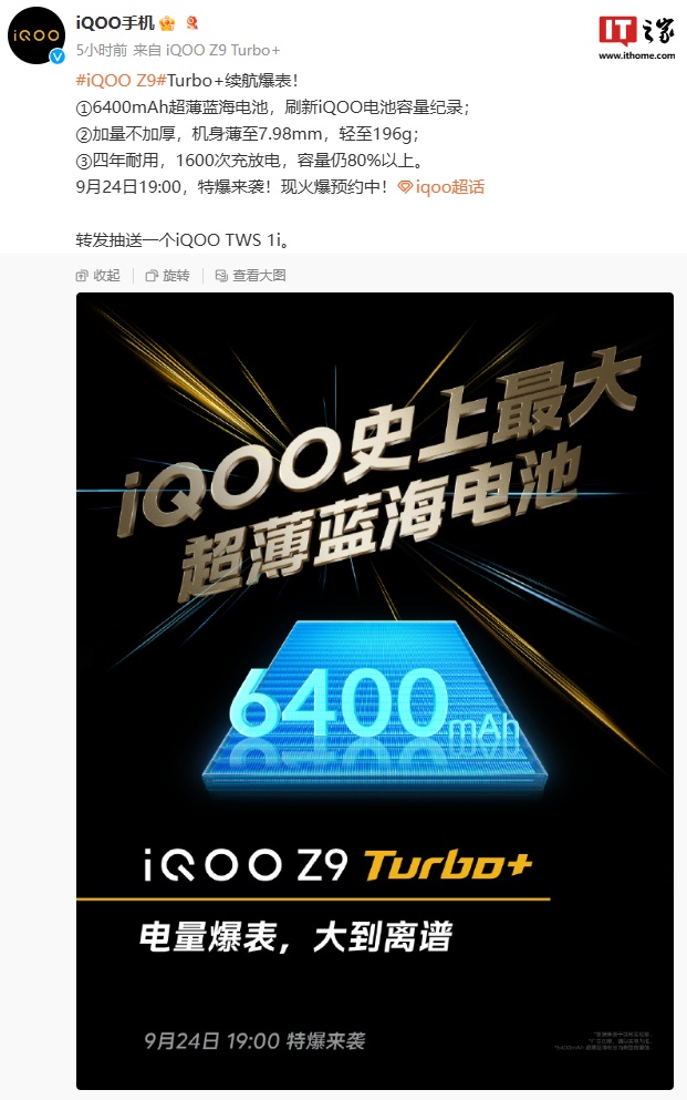 预热信息显示,iQOO Z9 Turbo + 搭载 6400mAh 超薄蓝海电池,刷新 iQOO 电池容量纪录。机身薄至 7.98mm,轻至 196g;(电池)四年耐用,1600 次充放电,容量仍 80% 以上。