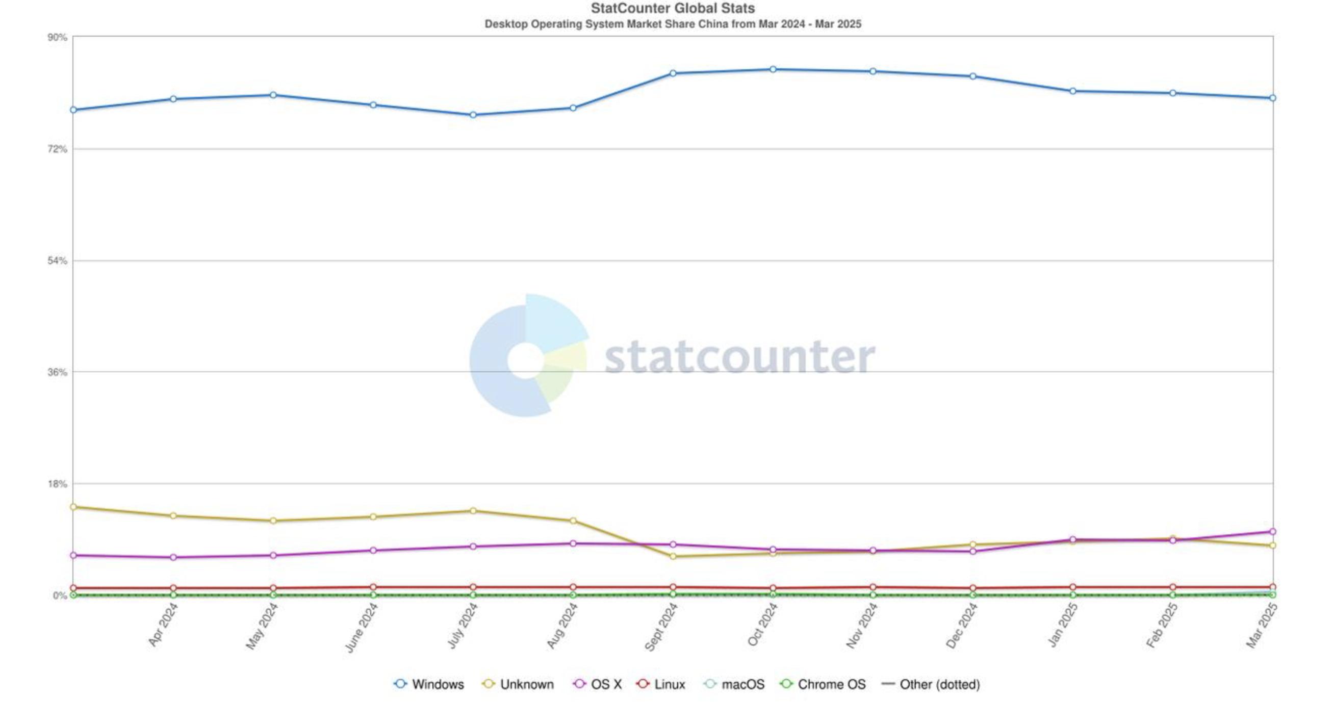 今年 3 月,苹果 macOS 在中国桌面操作系统的市场份额首次突破 10%,超越此前最高的 9.94%(疫情期间)份额表现,创下自 2009 年有统计以来的历史新高表现。