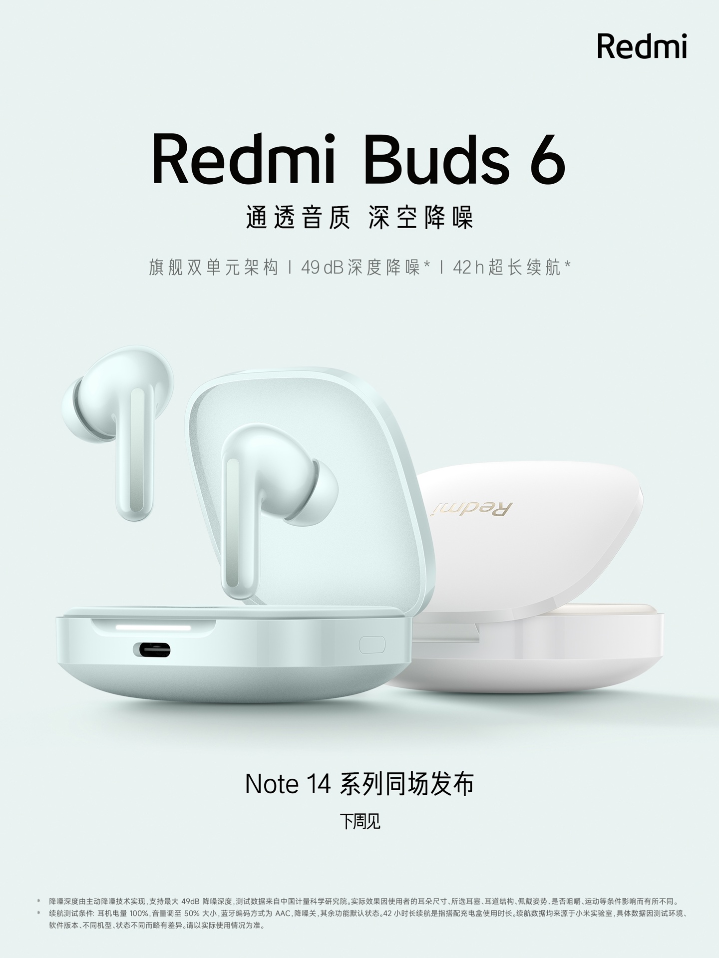 小米 Redmi Buds 6 耳机将于下周与 Redmi Note 14 系列同场发布,Redmi Buds 6 耳机搭载圈瓷双单元,支持最大 49dB 降噪深度、总续航 42 小时。