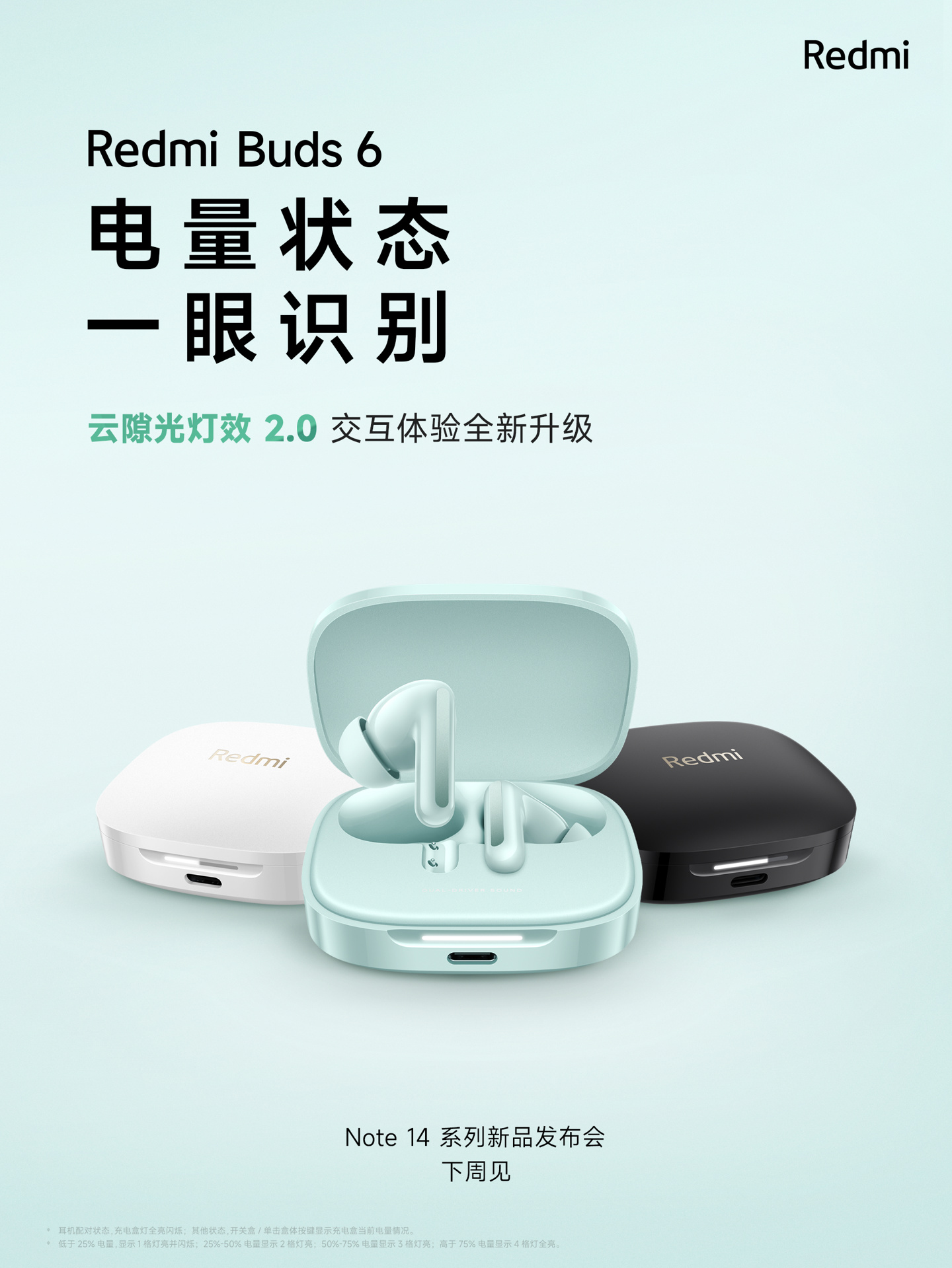 IT之家 9 月 20 日消息,小米智能生态官方预热,Redmi Buds 6 耳机升级“云隙光灯效 2.0”,新增充电盒电量状态显示。
