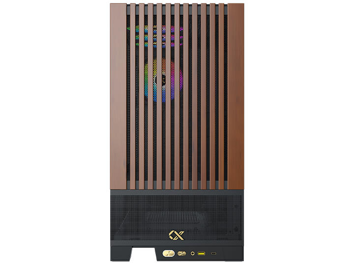 Endorphin WD 机箱正面采用三段式设计,上部为木制格栅面板,电源仓位置是点缀以富钧金色商标的 MESH 透风网孔,底部则是兼具前置 I/O 面板功能的脚座。