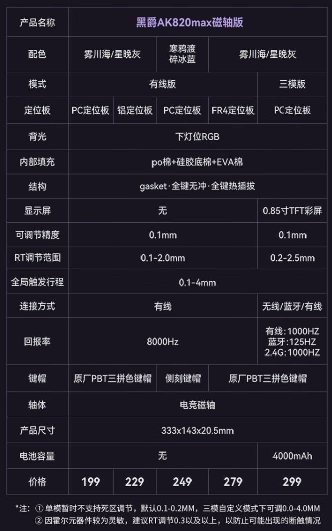 该款键盘属于换色系列产品,整体配置与黑爵磁轴键盘 AK820 MAX 保持一致,详情如下: