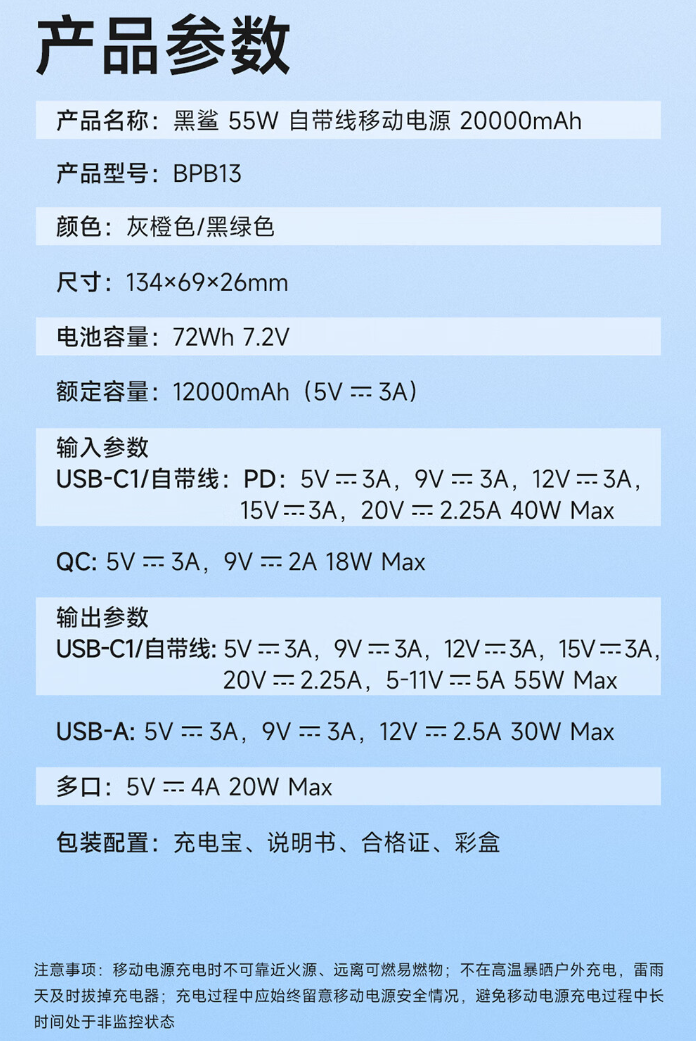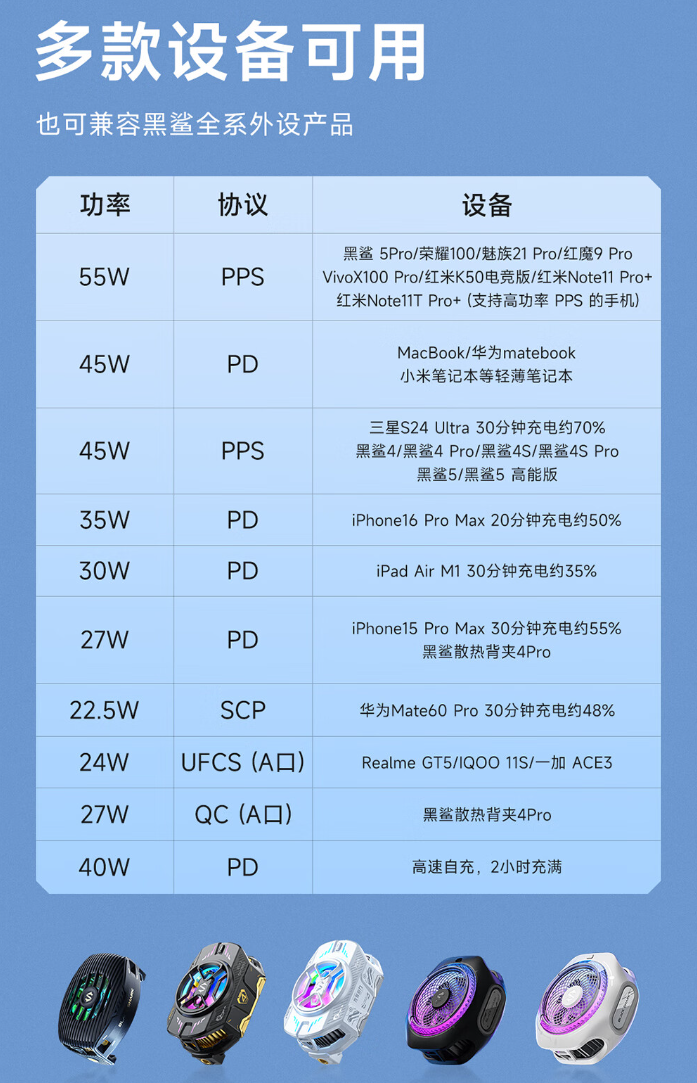 IT之家附黑鲨 55W 自带线移动电源适配情况、产品参数如下:
