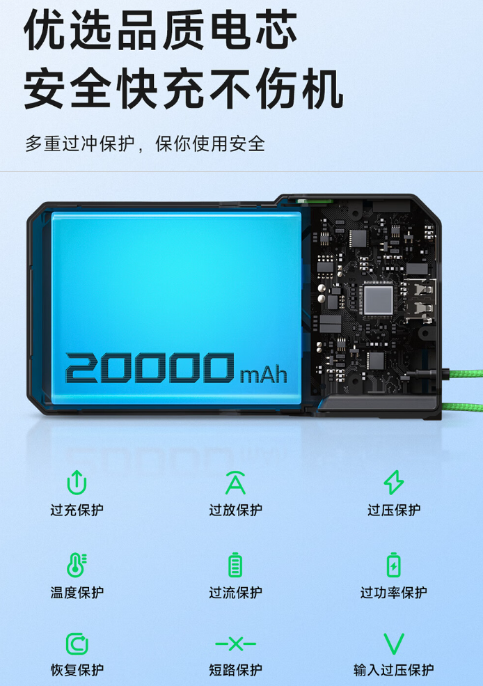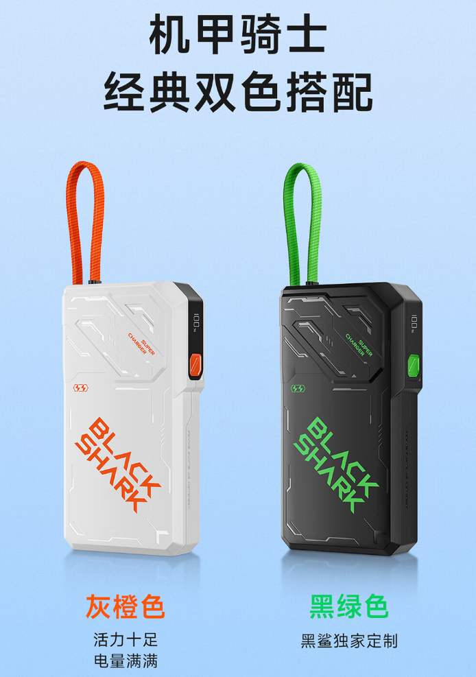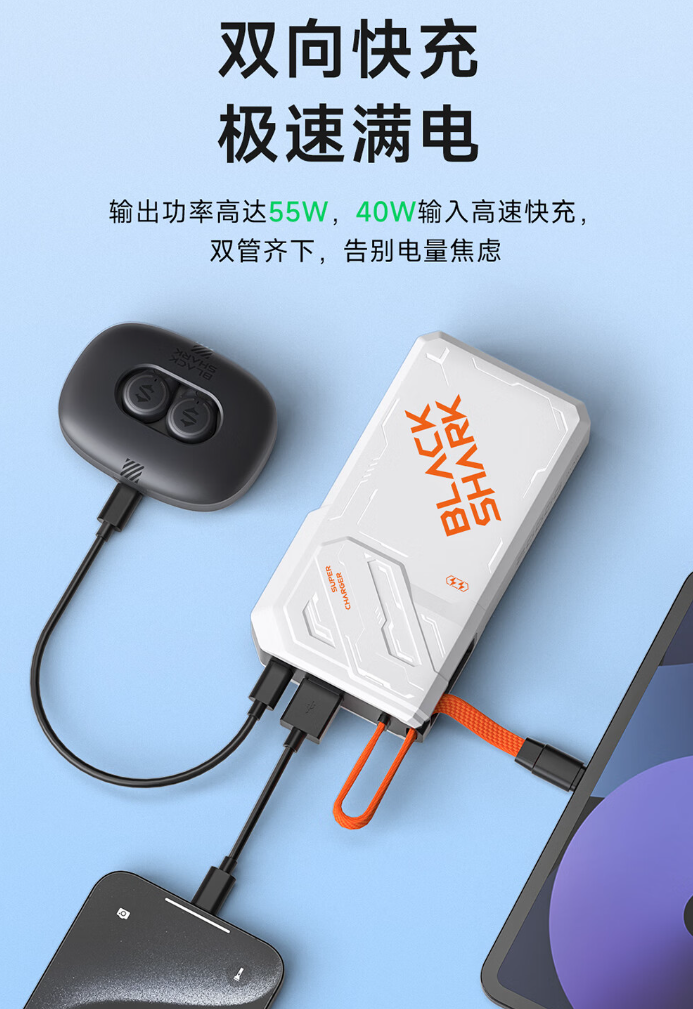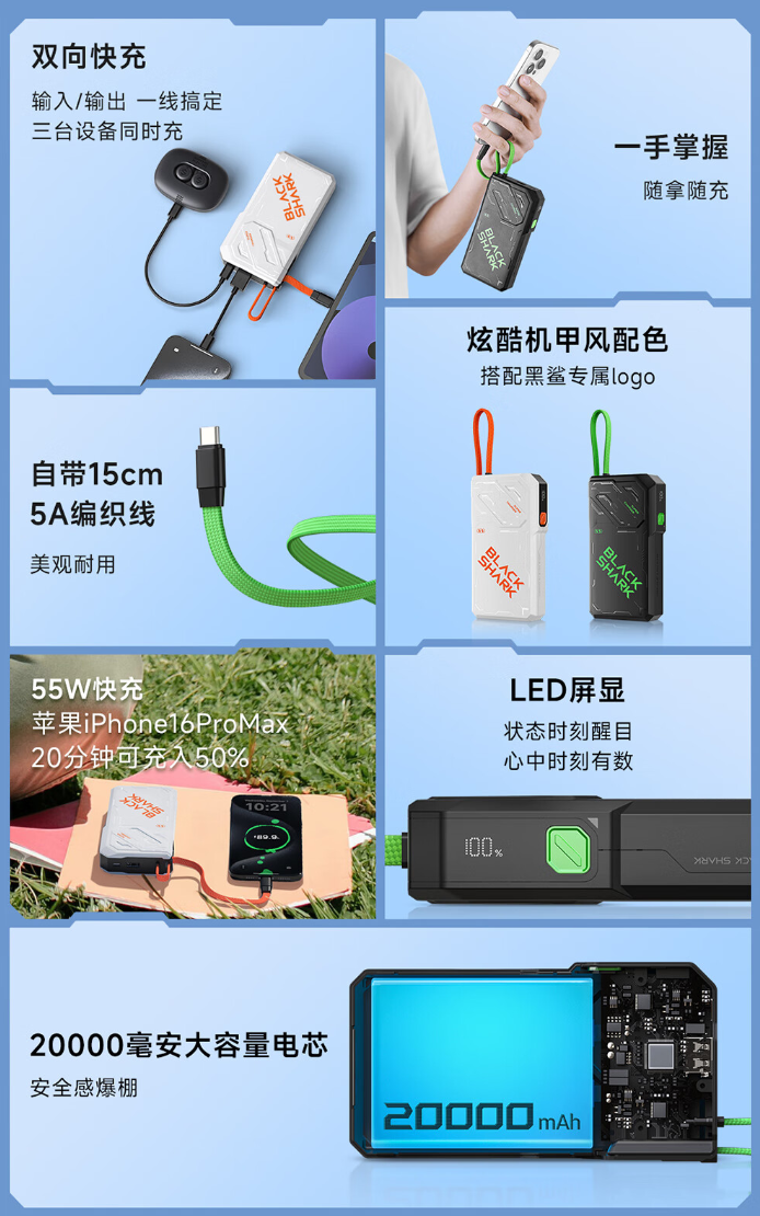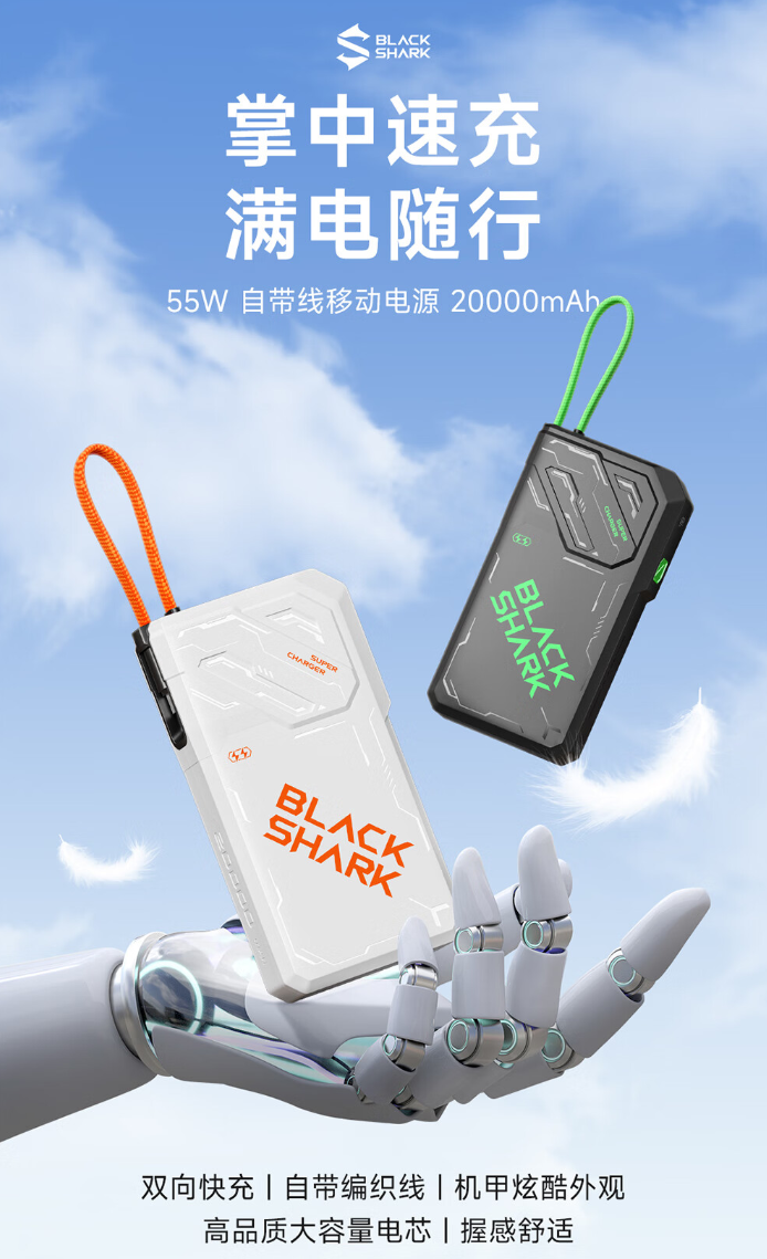 该款移动电源机身采用机甲风配色,搭配黑鲨专属 Logo;移动电源自带 15cm 5A 编织线,支持 55W 快充,官方宣称苹果 iPhone 16 Pro Max 手机 20 分钟可充入 50%。