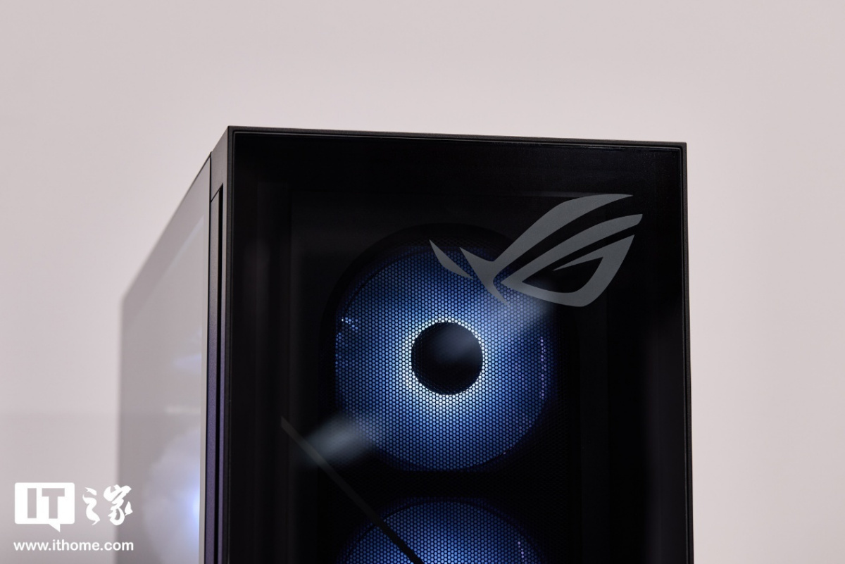 ROG 魔霸 9X 机箱前面板顶部有一个大大的败家之眼 Logo,面板上 2 道非对称斜切装饰,让造型更加利落和帅气,半透明 + 熏黑处理的外壳能够让内部 3 风扇的周围更有包裹感,灯效神秘且不张扬。