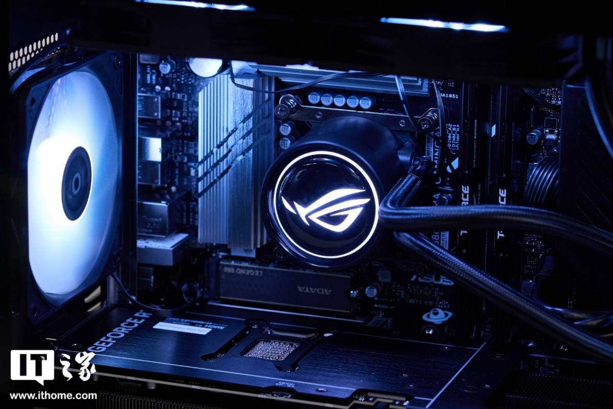 机箱侧面是超大全景透视窗,带有海景房的设计理念,但黑透处理将灯光质感烘托得更加高级。CPU 水冷头自带会发光的败家之眼 Logo,顶部 240 水冷风扇和后侧的出风扇都支持 RGB。