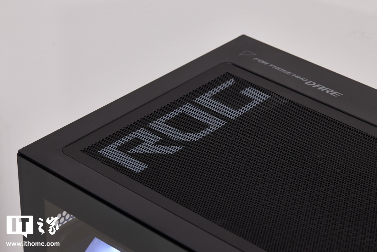 机箱顶部是带有 ROG Logo 的防尘网,旁边还印着 FOR THOSE WHO DARE 的经典品牌标语。顶部接口给得不少,包括: