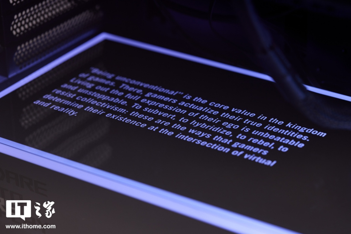 机箱内部最下方的灯箱设计也是一大特色,巧妙收纳了电源仓和硬盘仓,表面做了丰富的发光装饰元素,将 ROG 的 Logo,品牌标语和设计感全部融入其中,彰显出品牌信仰和文化属性。尤其是包裹整个边缘的包边光条,强化了灯箱的立体感,让底部空间不再有空旷感。