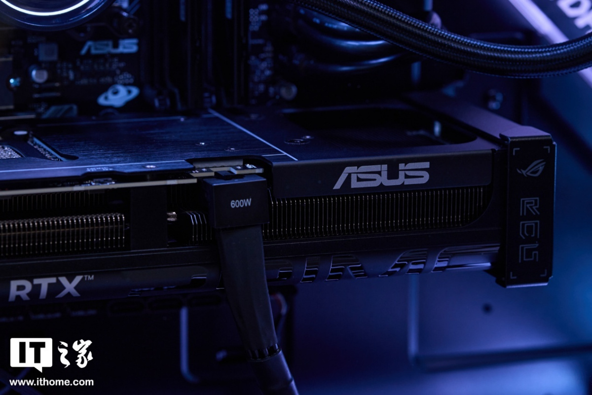 显卡右侧被印有 ROG 大眼 Logo 和文字 Logo 的显卡支架稳稳托住,一直延伸到主板顶部齐平位置,让显卡的固定更加牢靠,也起到了一定的藏线作用。